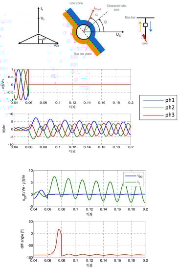 Figure 2 shows an example of waveforms in case of 3-phase fault. The fault occurs in the time 0.06 s where the voltages in all phases drop. The fault’s currents increase to maximum values which depend of the SC power ratio and the system impedance. In this case, the relation between the phase 1 current and U23 voltage (polarization magnitude) and their angle difference is shown.