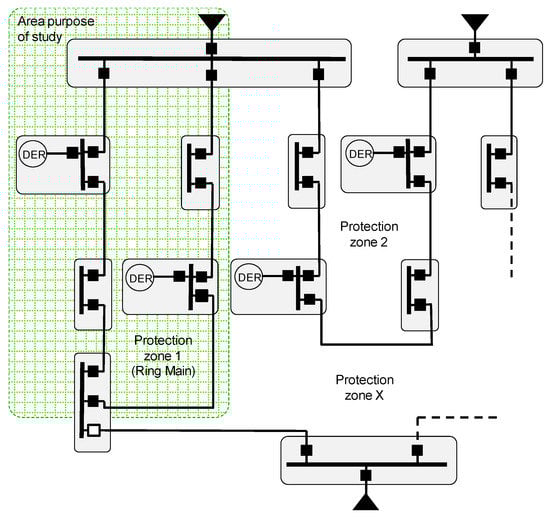 The DER penetration in distribution network can affect mainly to three network aspects: the voltage quality, the current quality and the stability of the system [13]. As mentioned before, one of the objectives of this paper is to find an adaptive network protection for current faults. Therefore, some modification may be necessary regarding the number of DERs that are working in each possible scenario, as shown in Figure 3. According to [14], it will be necessary to introduce a new current setting, a new time setting or even to enable or disable directional protection when a DER is present in the electrical bus. More concretely, the scope of the study in this paper is the protection zone 1 shown in Figure 3.