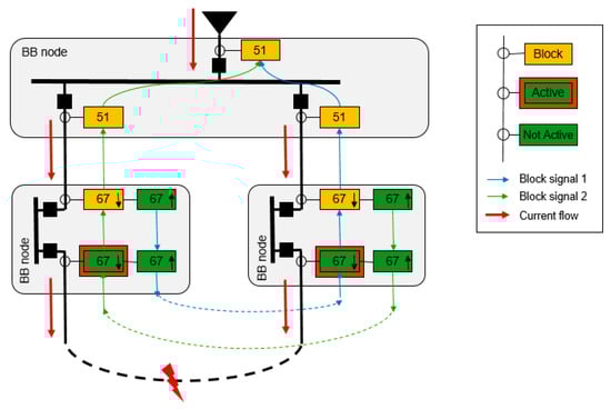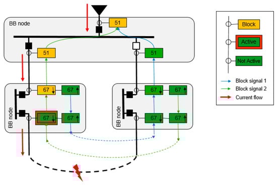 In order to implement a priority and to allow the fault isolation only from the closest IEDs to the fault point, it establishes an automatic sequence by ANSI 67/67N protections called logic discrimination. In case of a fault, this sequence sends a temporary block signal (Block Indication) from each IED to their adjacent, in the opposite direction where the fault current comes from. These signals allow a temporary blocking of every IED, except of the closest IEDs (non-blocking ones, because they are not blocked by other), which they are going to trip themselves and to execute a fault fast path isolation in the minimum setting time (typically between 50–100 ms).