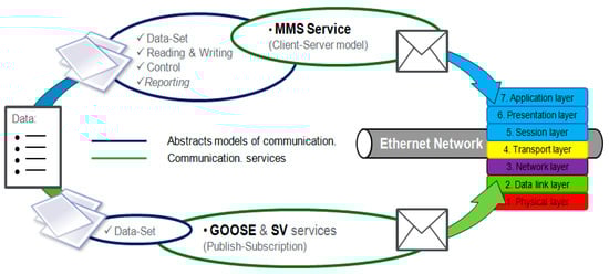 IEC 61850-8 and 9 standard parts describe the set of communication models and services in order to allow the exchange of the data model information between different IED in electrical power systems. The goal is the deployment of automation of the electrical system by sending data groups of different IED LNs. Figure 8 shows the abstract models and communication services defined in the standard. Finally, they are mapped or encapsulated over an Ethernet network frame.