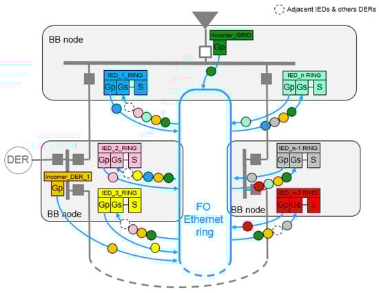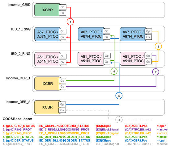 The GRID_STATUS GOOSE provides information to the other IEDs about the operating mode. On the other hand, DER_STATUS GOOSE provides the information about the presence of the incomer DER_X in the ring. This information will get to the Gs of each ring IED and it will change the protection configuration and settings (S).