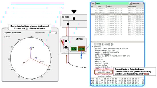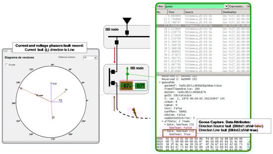 Moreover, the protective system is based in an Ethernet communication network. It means that it is necessary to consider, as in every Ethernet implementation in the industrial environment in a critical power system, the redundancy and back-up power supply for all the devices of the system (IEDs, CB motor supply, switches, and others control and protection equipment) to ensure the reliability of the system. Ethernet redundancy protocols are also used such as (RSTP, HSR, PRP, etc.) in order to avoid the failures in the communication network. Thus, to fully understand the application of the ANSI 67/67N using GOOSE service several tests were realized and results are shown as follows. Figure 15 shows a simulation of a phase fault in the phase 2 of a power system. The tested Sepam senses the fault current direction to line and it sends to the opposite direction the blocking indication 1 (BlkInd1) to block the action of adjacent IED. After the setting time, the CB associate in order to isolate the fault relays opened. By means of an Ethernet conventional network analyzer software, it was captured that the blocking indication 1 (BlkInd1) is activated and it triggers a set of GOOSE.