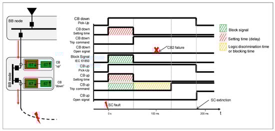 In addition, it was checked that both block indications return to the inactive state after blocking time of its activation. It allows that in case the CB down is not operating, the next one is ready to trip after this time. Figure 17 shows the sequence in the case of CB (CB2) open failure and the action of the adjacent CB (CB1), according IED algorithm in [30].