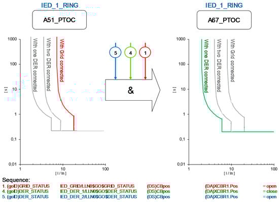 The algorithm provides changes in settings protection and even the kind of protection in order to adapt the IEDs to each new scenario. As shown in Figure 18, the IED_1_RING changes the kind of protection and the settings after receiving the change of the GOOSE services from Incomer GRID and incomer DERs 1 and 2.