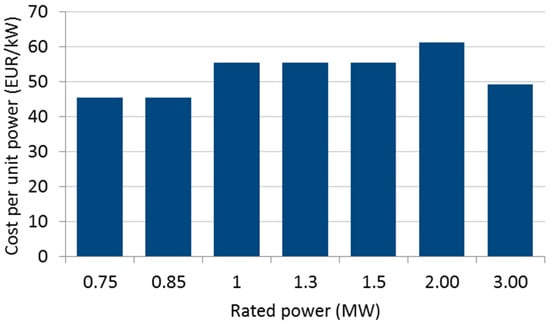 In light of the above, it can be assured that gearboxes are and will continue to be a key component in modern wind turbines. In addition, it is also worth noting that the gearbox plays an important role in the breakdown of costs, comprising typically between 6–19% [4,5,6] of the total upfront costs of geared wind turbines (these values largely depend on whether shafts and bearings are included in the cost analysis). Also, as wind turbines become larger and require higher transmission torques while maintaining the maximum possible compactness, the cost per unit of power of gearboxes is expected to increase. This fact can be observed in Figure 1, which shows the trend of gearbox cost depending on wind turbine rated power in the Chinese market in 2011 [7]. An exception can be observed in gearboxes for 3 MW wind turbines, which achieved an average cost per unit power at similar values than the gearbox for 750/850 kW wind turbines. This can be explained by a high demand of gearboxes in the 3 MW wind turbines and a high standardisation of the production process.