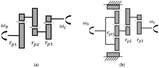 Figure 2a displays an example of a typical configuration of a fully-helical (or spur) gearbox (only containing parallel gears), whereas Figure 2b depicts a hybrid gearbox (one planetary plus two parallel stages). This latter has a first planetary multiplication stage with ratio rpl1 followed by two helical gears with multiplication ratios of rp2 and rp3. The relation of the input velocity, ωb, (blades rotational speed) to the output velocity, ωc, (the generator rotational speed) is as follows: