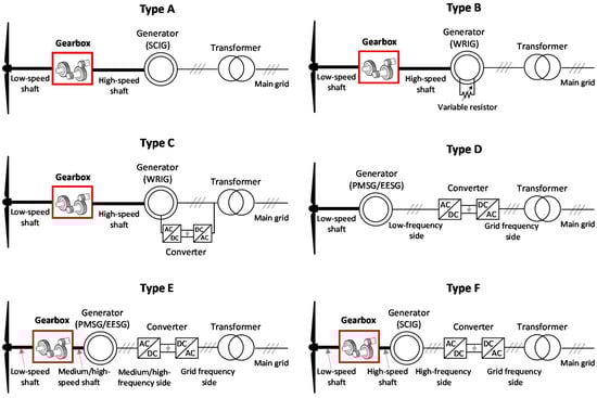 As stated in the introduction section, the drive train converts the mechanical power captured by the wind turbine rotor blades into electric power. The steps involved in this conversion, and hence the drive train components, depend on the configuration. Hansen et al. [11] presented a wind turbine classification that has been widely used in the existing literature. This classification was further extended by Serrano and Lacal [16], also including hybrid arrangements with full power converter and gearbox. A brief description of this classification is provided in the following lines (see also Figure 3):