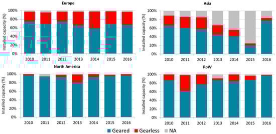 Figure 4 shows the evolution over the period 2010–2016 of geared and gearless wind turbines in the markets under study: Europe, Asia, North America, and the rest of the world (hereafter as RoW). A dominant role of the geared turbines can be clearly appreciated in all of the markets, although the incidence of gearless wind turbines has increased over the years in the European and Asian (Please note that the quality of the results for the Asian market is relatively limited in the period 2013–2015, due to the low availability of public data) markets. Nevertheless, in general terms, this trend is reversed in the last years with a rebound of the market penetration of geared wind turbines, especially in 2015–2016 in Europe, in 2016 in Asia and in 2014–2016 in North America and the RoW.