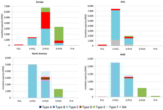 To sum up, the overall evaluation of the wind turbine rated power depicted in Figure 6, shows that there exists a prevalence of 2–3 MW turbines in Europe (with almost 50–50% of drive train arrangements Types C and D) but also an important number of high powerful wind turbines (larger than 3 MW and consisting especially on the hybrid configuration Type E), whereas the North American, Asian and RoW markets are mainly dominated by 1–2 MW wind turbines with drive trains of Type C.