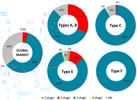This section focuses on the gearbox arrangements used for each type of geared drive train, i.e., Types A, B, C, E, and F. Type D arrangement is excluded from the analysis as it does not require a gearbox. In this sense, Figure 7 shows the number of stages of the gearboxes of these drive train configurations in the global onshore wind market. As observed, the 3-stage gearboxes have a prominent role representing at least 60% of the global market, followed far by the 2-stage gearboxes only amounting by 4%. 1-stage and 4-stage gearboxes display a marginal share.