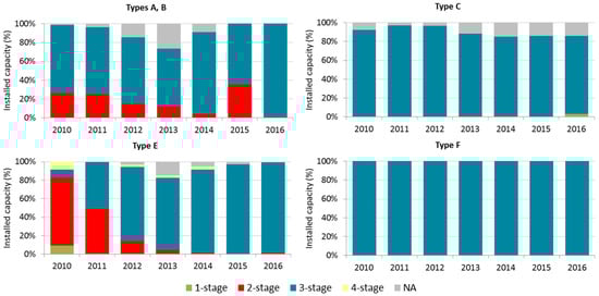 Figure 8 displays the evolution of the number of gearbox stages in geared drive train configurations in the global onshore market in the period 2010–2016. In Types A and B, 3-stage gearboxes hold a dominant position over the years, whereas 2-stage gearboxes display a decreasing tendency with the exception of the growth shown in 2015. As previously discussed, for both Types C and F, the 3-stage gearbox is the absolute dominant configuration during the period considered. Regarding Type E, the current trend towards wind turbines with higher nominal power and more compact synchronous generators has led to the use of gearboxes with a higher gearbox ratio and, therefore, a greater number of stages. As a consequence, 2-stage gearboxes display a severe decrease from 2010 almost disappearing in the new installed from 2014 onwards. Additionally, 1-stage gearboxes were assembled in this drive train configuration in only 2010. The lower role of 1- and 2-stage gearboxes is due to the higher presence of medium-speed synchronous generators at the beginning of the decade for this arrangement.