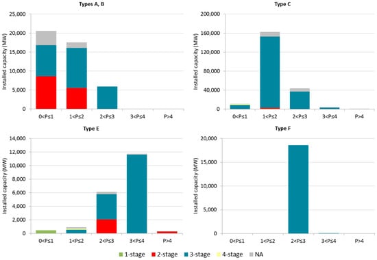 As it happens in Types A and B, two planetary stages prevail in wind turbines with Type C configuration and high nominal power (i.e., above 2 MW) also displaying a dominant share in the range 2–3 MW. On the contrary, one planetary stage predominates in wind turbines with nominal power lower 1 MW. Three planetary stages display an increasing share in the installed capacity as wind turbines have a higher nominal power.