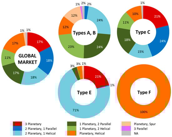 Based on the drive train configuration, the Types C and F arrangements are almost and totally dominated by 3-stage gearboxes representing at least 90% and 100%, respectively. Even though the 3-stage gearboxes also prevail in the Types A, B, and E, 2-stages gearboxes play a relevant role amounting by 32% in Types A and B and 12% in Type E. The 4-stage gearboxes are marginally used in wind turbines with Type C and Type E, mainly due to the higher torque to be transmitted.
