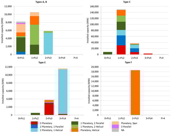 Based on the drive train configuration, in Types A and B (mainly implemented in wind turbines with nominal power below 2 MW) most of 3-stage gearboxes combine the use of either 1 planetary stage (identified in 47% of installed capacity of these configurations) or 2 planetary stages (in 26% of installed capacity) with 2 or 1 parallel stages, respectively. On the contrary, the gearboxes consisting of three planetary stages exclusively are not used in these drive train configurations due to the lower transmission ratio and compactness requirements for those rated power levels. In Type C configuration using 3-stage gearboxes, the planetary stages have a more dominant role in order to transmit the resistance of the torque at the initial stages, being able to provide the required transmission ratio while maintaining the gearbox compactness. Thus, three planetary stages represent 21% of installed capacity of this configuration and two planetary stages have a dominant role by amounting to 39% of the installed capacity. Unlike Types A and B configurations, one planetary stage has a lower role with 29% of installed capacity. The 3-stage gearboxes in Type E arrangement are dominated by two and three planetary stages representing 72% and 21% of installed capacity, respectively. As mentioned in Section 3, in Type E configuration it is possible to achieve a trade-off between two opposing effects (the gearbox size and the asynchronous generator size). This fact, along with the high-power ratings of wind turbines using this configuration, makes compactness a priority and further encourages the use of planetary stages. Type F configuration uses planetary/helical gearboxes although it has not been possible to identify the actual number of planetary stages in this configuration.