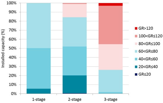 Figure 12 shows the percentage of global cumulative installed capacity corresponding to different ranges of the gearbox multiplication ratio according to the number of gearbox stages. As expected, the smaller the number of stages is, the lower the overall GR (gearbox ratio) is. For 1-stage gearboxes (configuration with some relevance only for drive train Type E and rated powers below 1 MW), the gearbox ratio ranges from values 20:1 to 80:1. In the case of 2-stage gearboxes (only relevant for drive trains Types A and B as well as for the medium/high-speed hybrid configuration, Type E), the variety of gearbox ratios is larger, ranging from 20:1 to 100:1 (with some marginal presence of two-stage configurations below and above these values). Finally, in 3-stage gearboxes (corresponding to the majority of gearboxes used in modern turbines, and virtually all high-speed wind turbines for drive train Types C and F), the diversity of gearbox ratios increases considerably, ranging from around 40:1 to even above 120:1.