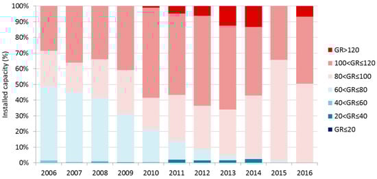 Figure 13 represents the evolution of the gearbox multiplication ratio from 2006 to 2016. As observed, there is a trend towards higher multiplication ratios, with a clear convergence to GR values in the range 80:1–120:1 and a significant decline of GRs below 60:1, achieving a marginal role at the end of the period under study. Nevertheless, from 2010 onwards, GRs in the range 100:1–120:1 seem to lose market in favour of more moderate ratios (around 80:1–100:1). It is also worth mentioning that there is a growing presence of very high multiplication factors (above 120:1) during the period 2010–2014. Even though this trend seems to be reversed in 2015, these higher GRs emerge again in 2016. These recent trend changes, towards slightly lower gearbox ratios, are the result of a greater market penetration of the Type E drive train configuration (in which the multiplication factor can be reduced at the expense of installing larger generators). Finally, it is also worth noting the very moderate role of extremely low GRs (below 40:1) in the period 2011–2014, corresponding to medium speed turbines, under the Type E drive train configuration.