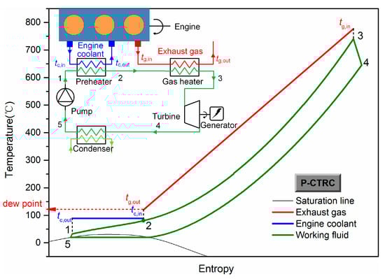 Currently, engine waste heat recovery (E-WHR) is attracting increasing interest, which is an effective means to improve fuel utilization efficiency of engines. Among engine waste heats, exhaust gas and engine coolant are the main carriers. Exhaust gas is a high-grade waste heat source, which is generally regarded as the first recovery target. In Wang’s research on E-WHR, a diesel engine and a gasoline engine are selected as the recovery objects, whose exhaust temperature approaches over 700 °C and over 400 °C, respectively [1]. While, engine coolant is a relative low grade waste heat, whose temperature is below 100 °C, but still significant due to the comparative amount of waste heat [2]. Using a thermodynamic cycle to generate extra power is a high-efficiency way among the technologies of E-WHR, mainly including single-loop organic Rankine cycle (ORC) [3,4], dual-loop ORC [5,6], steam Rankine cycle [7,8], CO2-based transcritical Rankine cycle (CTRC). Moreover, thermodynamic cycle is a feasible scheme to make a combined recovery of exhaust gas and engine coolant. Engine coolant can be used as a preheating source based on the basic use of exhaust gas.