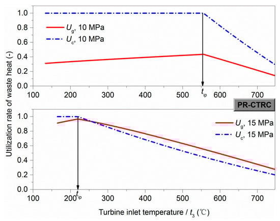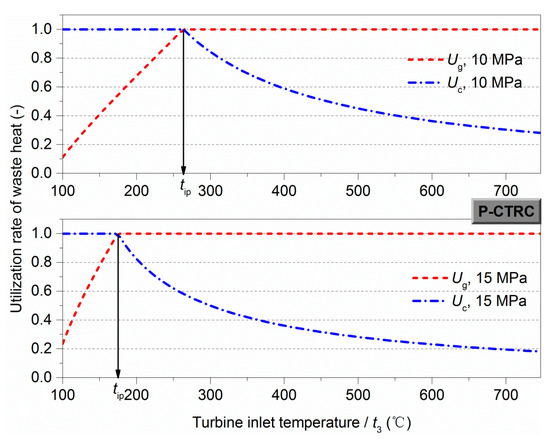 For the PR-CTRC, there exists a maximum turbine inlet pressure, no tip occurs above it. The maximum turbine inlet pressure is 15.5 MPa in this study. With an increase in P3, the temperature difference between the turbine inlet and outlet becomes larger, which reduces the regenerated degree of turbine outlet fluid. When the P3 is higher than the maximum value, there is no regenerated condition for the PR-CTRC. At this situation, the PR-CTRC can be considered as the P-CTRC actually. Hence, the end of tip for the PR-CTRC in Figure 10 approaches to the variation line of the P-CTRC. Different with the P-CTRC obtaining complete recovery of exhaust gas at tip, the PR-CTRC has a maximum utilization rate of exhaust gas (Ug,max), as shown in Figure 10. The Ug,max increases with an increase in P3, then approaches to 1 at the maximum P3 of each system, whose principle is similar to the discussion of tip. It indicates that both complete recovery of exhaust gas and engine coolant cannot achieve in the PR-CTRC, which only occurs in the P-CTRC.