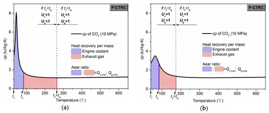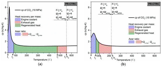 Therefore, the heating process in the regenerator is added to cp figure, shown as the green area in Figure 7a,b. Similarly, these two figures show the heat absorption capacity of working fluids at the “ideal point” of the PR-CTRC. As shown in Figure 7a, due to a low pressure ratio when P3 is 10 MPa, a high turbine outlet temperature is produced, further causing a large temperature range of the regenerated process in the regenerator. This results in that the ratio between the blue and red area is far less than the “complete recovery ratio”. Hence, the Ug,max at P3 = 10 MPa is 0.42, much less than 1. Differently, when P3 is 15 MPa, regenerated heat has little impact on the application temperature range of exhaust gas. The ratio between the blue and red area is still close to the “complete recovery ratio” (Figure 7b), following causes a high Ug,max (0.97). Therefore, from the perspective of sufficient use of energy, the PR-CTRC is suitable operating at the “ideal point” of 15 MPa versus to that of 10 MPa.