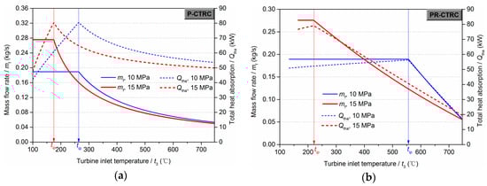 Variation of mass flow rate of working fluid and total heat absorption with turbine inlet conditions (P3, t3): (a) P-CTRC; (b) PR-CTRC.