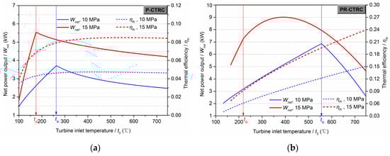 Although the “ideal point” has maximum mass flow rate and total heat absorption, it does not mean the maximum net power output as shown in Figure 9. There is a peak value existing in the variation line of net power output for the P-CTRC and the PR-CTRC. The corresponding turbine inlet temperature at the peak is identical with tip for the P-CTRC at 10, 15 MPa (Figure 9a) and the PR-CTRC at 10 MPa (Figure 9b). But for the PR-CTRC at 15 MPa (Figure 9b), the net power output variation trend only has change of increase rate and does not represent the maximum net power output. With a tighter connection with turbine inlet temperature, the highest thermal efficiency appears at high turbine inlet temperature range as expected, which has no link to the “ideal point”.