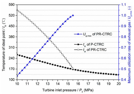 Variation of tip for the P-CTRC and PR-CTRC, and maximum utilization rate of exhaust gas for the PR-CTRC with turbine inlet pressure.