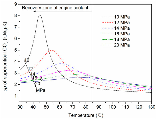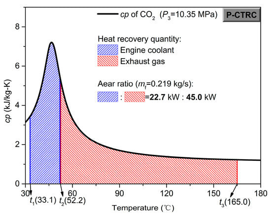 Similar with the analysis in Section 3.1, this process in cp perspective using condition 5 as an example is shown in Figure 16. The CO2 absorbs 22.7 kW heat from the engine coolant in the preheater with a temperature increase from 33.1 °C to 52.2 °C, and absorbs 45.0 kW heat from the exhaust gas in the gas heater with a temperature increase from 52.2 °C to 165.0 °C. It is obvious to find that heat recovery zone of engine coolant locates around the critical area, and benefits the peak of cp peak of supercritical CO2. In the preheater, CO2 temperature only gets 29.1 °C increase, but large amount of heat absorption is obtained. Therefore, it proves that the waste heat recovery of engine coolant with characteristic of low-grade but large-amount can be accomplished by the P-CTRC in a narrow temperature range. On this basis, it still does not affect the full recovery of exhaust gas.