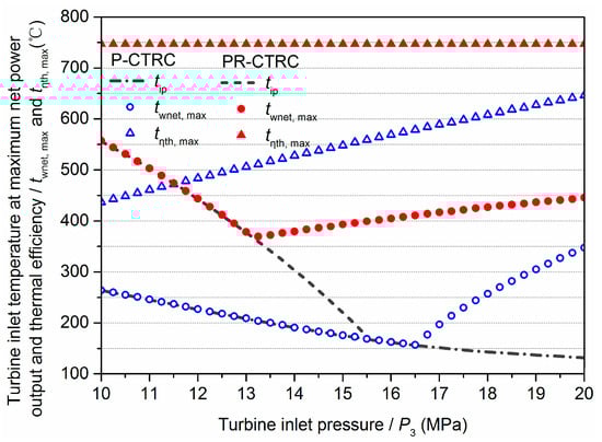 As a comparison with tip, the turbine inlet temperature at each P3 where can get maximum net power output (twnet,max) and thermal efficiency (tη,max) is shown in Figure 12. The twnet,max is equal to the tip firstly with an increase in turbine inlet pressure, then goes through a transition point and be different with tip. The transition pressure for the P-CTRC and the PR-CTRC is the 16.5 and 13.0 MPa, respectively. Different with the twnet,max and tip, the tη,max remains high value, especially for the PR-CTRC always being the highest turbine inlet temperature (747 °C). Therefore, a consequence we can get from these performance laws is that maximum net power output can be also obtained when system design at the ‘ideal point’ of low pressure range (<13 MPa for the P-CTRC, <16.5 MPa for the PR-CTRC). While, parameters selection would be considerable at high pressure range. The tip, twnet,max and tη,max are at low, mid and high turbine inlet temperature range. As an example, when the P-CTRC at 20 MPa, tip, twnet,max and tη,max is 132, 347, 646 °C. Decision to select turbine inlet temperature depends on the system tending to the “ideal point” or the maximum net power output or the highest thermal efficiency.