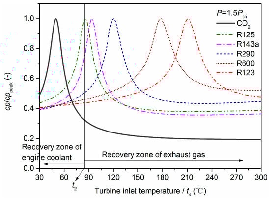 The application temperature range of engine coolant is narrower than that of exhaust gas, but the energy of engine coolant is approximate equivalent to that of exhaust gas (Qc,max/Qg,max = 0.870). Therefore, higher cp is required in the application temperature range of engine coolant than that of exhaust gas if systems aim to realize complete utilization of exhaust gas and engine coolant meanwhile. It is obvious to find that the cp peak of supercritical CO2 is just located in the application temperature range of engine coolant. The cp property of the supercritical CO2 exactly owns better combined condition for exhaust gas and engine coolant. Just as shown in Figure 13, the values of cp/cppeak of CO2 and some frequently-used organic fluids (R125, R143a, R290, R600 and R123) at 1.5 times critical pressure. Only the cp peak of CO2 is located in the application temperature range of engine coolant. On the contrary, most organic fluids has a slight change of cp under normal pressure, or owns a peak value of cp under supercritical pressure but located at higher application temperature range than that of engine coolant. This is the reason why the organic fluids is inefficient to utilize the engine coolant but enough for exhaust gas.