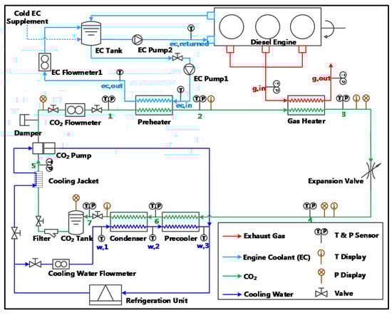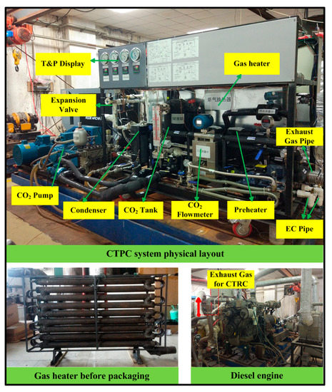 The P-CTRC prototype was constructed specially for E-WHR, whose practical layout is shown in Figure 14 and diagram is shown in Figure 15. The main components and measuring devices are listed in Table 4. As the turbine was not available and under design, an expansion valve was adopted temporarily instead of it to provide high and low pressures of the prototype.