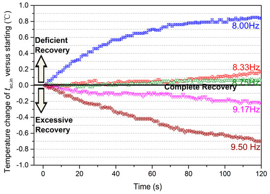 As shown in Figure 17, the results of temperature change at 120 s were obtained for five frequencies. The region of above and under 0 °C means the deficient and excessive recovery, respectively. From 8.00 Hz to 9.50 Hz, the flow rate of engine coolant increases, thus engine coolant crosses from deficient recovery to excessive recovery. When EC pump1 operates at 8.00 Hz, lacking engine coolant flows into the preheater and leads to deficient recovery, then makes tec,in has an increasing change of about 0.8 °C in 120 s. And for the 9.50 Hz, overmuch engine coolant flows into the preheater and leads to excessive recovery, then makes tec,in has about an decreasing change of 0.7 °C in 120 s. 8.75 Hz is optimal frequency among the five, and temperature change controls less than 0.1 °C. With necessary heat rejection of engine coolant on the pipe and EC tank under laboratory conditions, this optimal condition can be considered as the complete recovery condition of engine coolant. As shown in Table 7, the tec,back also indicates the same change performance but a smaller change than the tec,in, so the discussion of tec,in is effective.