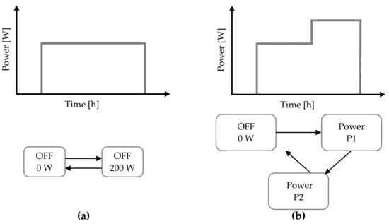 Finite state models: (a) two states model e.g., electric heating, toaster; (b) two operating modes appliances, e.g., lamp; (c) multiple states appliances e.g., devices on battery (with battery in charge/loaded battery); (d) multiple states and paths, e.g., oven, washing machine, dishwasher.