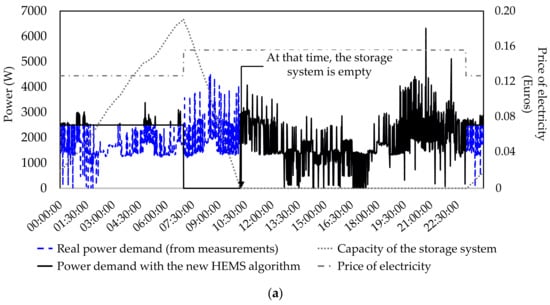 The first one (see Figure 21a) is based on the use of the storage system at any particular time. In particular, the storage system is charged during the peak hours (i.e., when the price of electricity is low). It is discharged without any smart control during off-peak hours (i.e., when the price of electricity is the highest). In that case, it is not possible to optimize the electricity consumption during the whole duration of the simulation because the system becomes empty very rapidly.