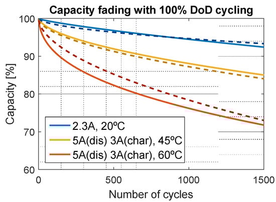 Comparison between the battery model implemented in this work and the manufacture’s datasheet: capacity loss due to cycling. Dashed curves are those obtained with the model [33].