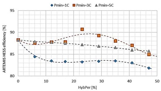 The energy efficiency results are shown in Figure 6 for topology 2 for the ARTEMIS cycle, with the most efficient control ().