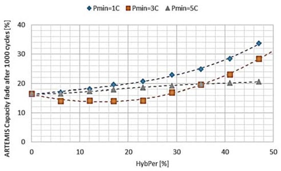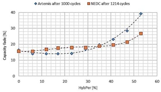 Figure 9 states that there is a considerable difference between both driving cycles when is below 10% and above 30%. It is noticeable that the capacity fade tendency follows the HESS efficiency, decreasing when the HESS efficiency grows. However, the minimum capacity fade does not necessarily match the maximum HESS efficiency at the same point, e.g., for the ARTEMIS cycle, the minimum capacity fade is obtained with a of 17% and the maximum HESS efficiency with 23%, while, for the NEDC cycle, the most suitable is 6%, which minimizes the capacity fade and maximizes the efficiency.