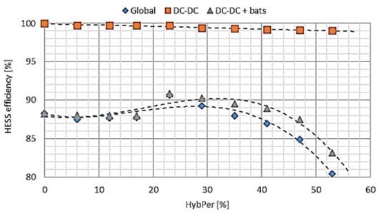 DC-DC, DC-DC and Battery, and HESS global efficiency for topology 2 () as a function of the hybridization percentage.
