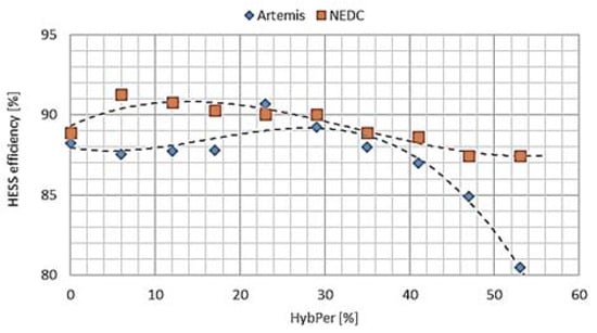 In order to illustrate the driving cycle dependency for the analysis proposed in this paper, Figure 7 compares the global HESS energy efficiency for ARTEMIS and NEDC driving cycles with the same control strategy implemented (). The HESS efficiency improves for both driving cycles compared to a conventional ESS (), reaching their maximum efficiency values at different .
