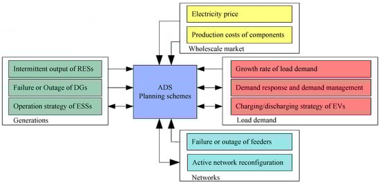 High proportion of DERs integration makes ADS planning methods take comprehensive account of high-level uncertainties which come from several aspects, including DGs, networks, load demand, and wholescale market, as shown as Figure 2.