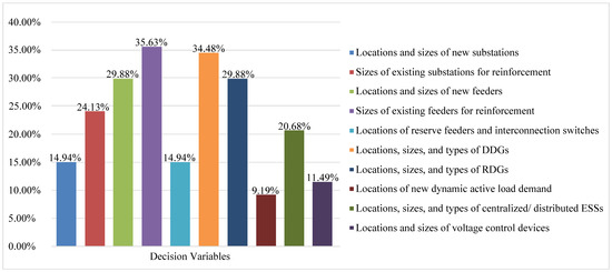The decision variables of ADS planning consist of the variables of traditional distribution networks, as well as the additional variables of DERs, as shown in Table 1. The distribution of decision variables in these surveyed papers is shown in Figure 3 and Figure 4.