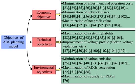 The planning objectives of ADS can be classified as economic objectives, technical objectives, and environmental objectives. Figure 5 provides several primary planning objectives, and other objectives not on the list are always the deformations of these primary objectives. Figure 6 provides the information about number of objectives.