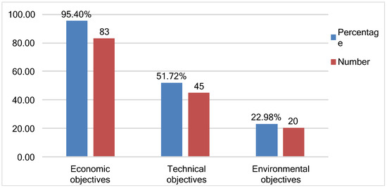 As shown in Figure 6, economic objectives are the most common planning objectives, and 95.40% of the surveyed papers involve economic objectives. On the contrary, only 22.98% of these planning models focus on the environmental objectives.