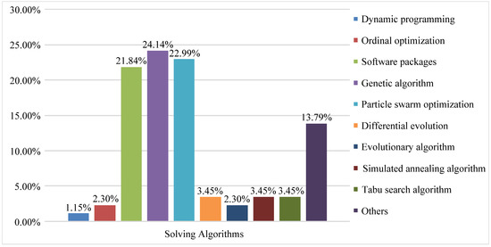 There are two main classes of algorithms to solve these planning models, including the numerical methods and the heuristic methods. The adoption situations of different algorithms are provided in Figure 7. It can be seen that genetic algorithm (GA), particle swarm optimization (PSO), and software tools based on the numerical methods are mostly adopted in these articles.