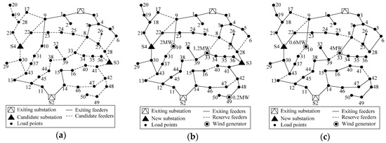 The 54-node, 33 kV network is adopted to investigate the availability and effectiveness of the proposed model and the GUROBI solving tool. The planning schemes are given in Figure 8.