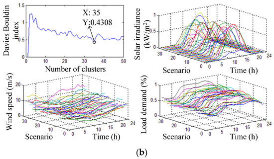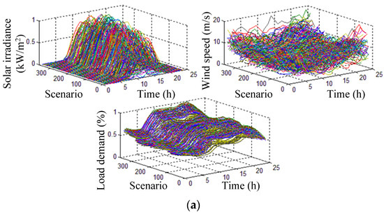 When probabilistic approaches are used to deal with uncertainties, there is an assumption that the probability distribution function (PDF) of input parameters is known. As the main sources of uncertainties, wind speed, solar irradiance, and load demand, are approximately assumed to follow Weibull distribution, Beta distribution, and normal distribution, respectively, as shown from Equations (2)–(4). Therefore, these PDFs are adopted to represent the high fluctuation and randomness features of wind speed, solar irradiance, and load demand in many articles [25,35,44,48,53,65,66,75,81,90].