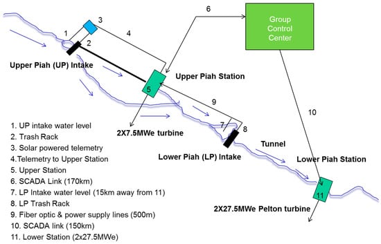 The hydroelectric system for the case study is an unmanned and very remote cascaded run-off river hydropower unit, consisting of two power stations: an upper station (2 × 7.5 MWe) and a lower station (2 × 27 MWe), as illustrated in Figure 1.