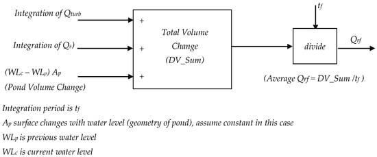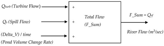 Instead of procuring expensive non-contactable type flow meters to measure the river flow, a new simple computing technique to estimate river flow is proposed. River flow can be computed by summing total turbine discharge flows, rate change of reservoir volumes and spillages. Let’s say the average river flow that feeds the lower station’s intake pond is Qrf. Using mass conservation, therefore the river flow should equal the summation of spillage (Qs), intake pond volume change (Delta_V/time) and discharge flows of turbines (Qturb), as given in either Equation (2) or (3). The summation is further illustrated in Figure 3 as a preliminary step prior to going into details of reasons that numerical integration is required to derive the river flow: