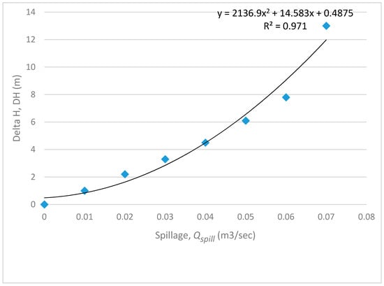 As for the spill flow, its relation with water level above dam crest is tabulated in Table 1. Spillage flow is Qs, while the height difference between water level and the dam crest is Delta_H or DH. Using values tabulated in Table 1 that had been obtained by measurements, using quadratic curve fitting, yielding Equation (6). The plot of spillage versus DH is shown in Figure 5: