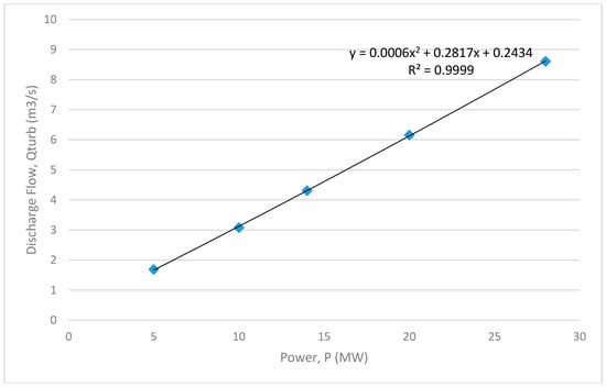 As for the turbine discharge flow, Qturb for each turbine can be computed if the power output of generator unit is known. The turbine discharge had been obtained by studying the turbine characteristics provided by manufacturers and recent performance tests. The relationship between turbine discharge flows versus power outputs is as given in Table 2. Using Table 2, one can plot a relationship curve between turbine discharges versus generator power outputs (as in Figure 6), also to find their relationship, as in Equation (7):