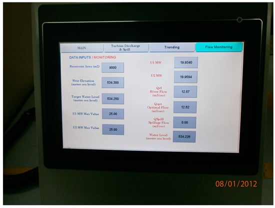 A picture of the HMI is as shown in Figure 10. The HMI with a touch screen provides facilities for operators to either initiate commands or enter coefficients or target water levels. Examples of coefficients are the floating constants needed by flow computations. Control buttons allow operators to put the controller into auto or manual mode that the appropriate memory bits within the PLC will be set or reset, and command buttons to raise or lower turbine discharge as well as entries for maximum limits of generator power outputs. Also, monitoring of crucial parameters and trending are among the pages included on the HMI.